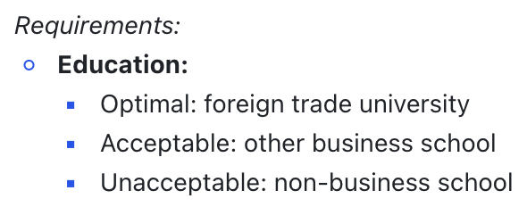 Example of Recruitment Request requirement. Layout the Optimal - Acceptable - Unacceptable